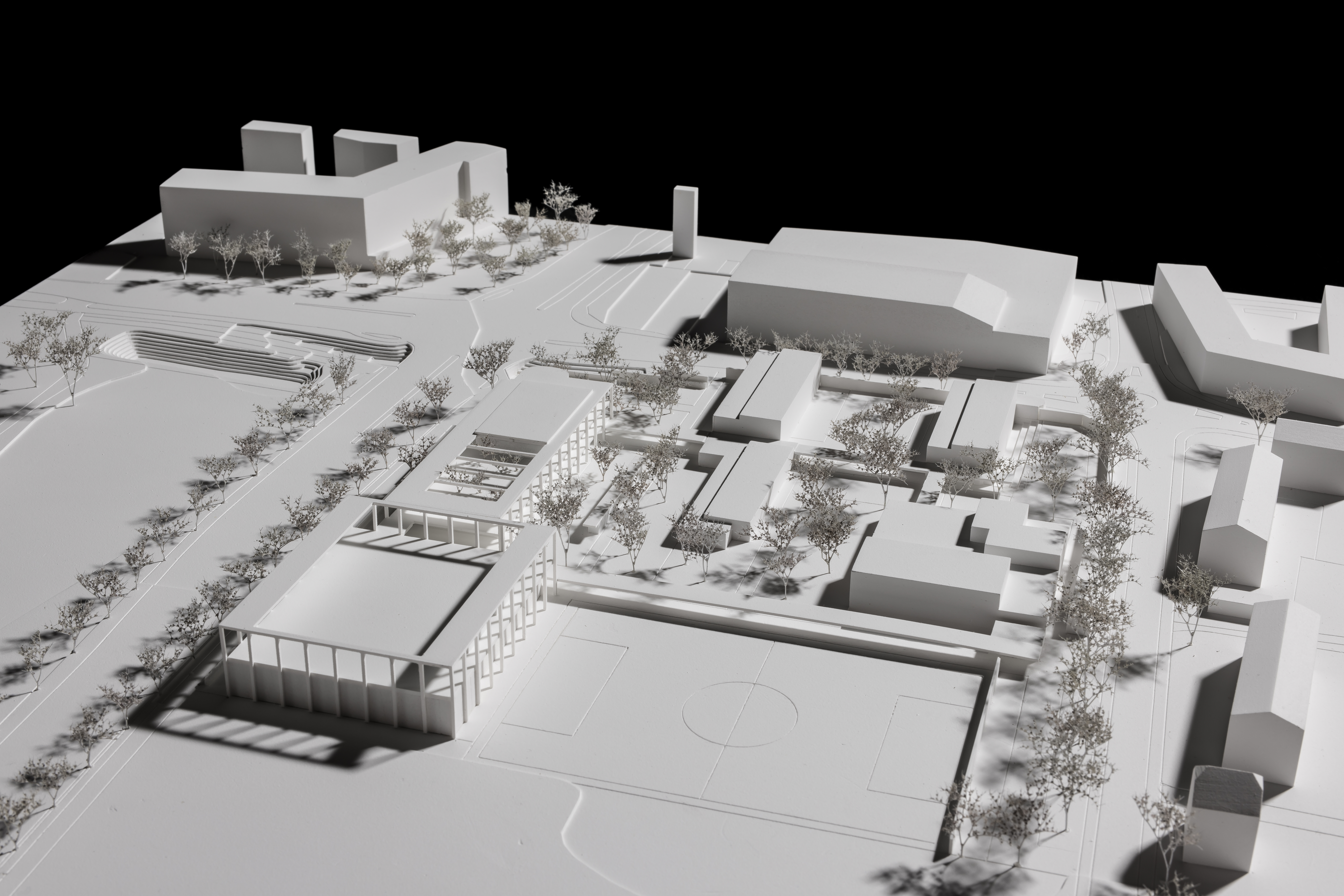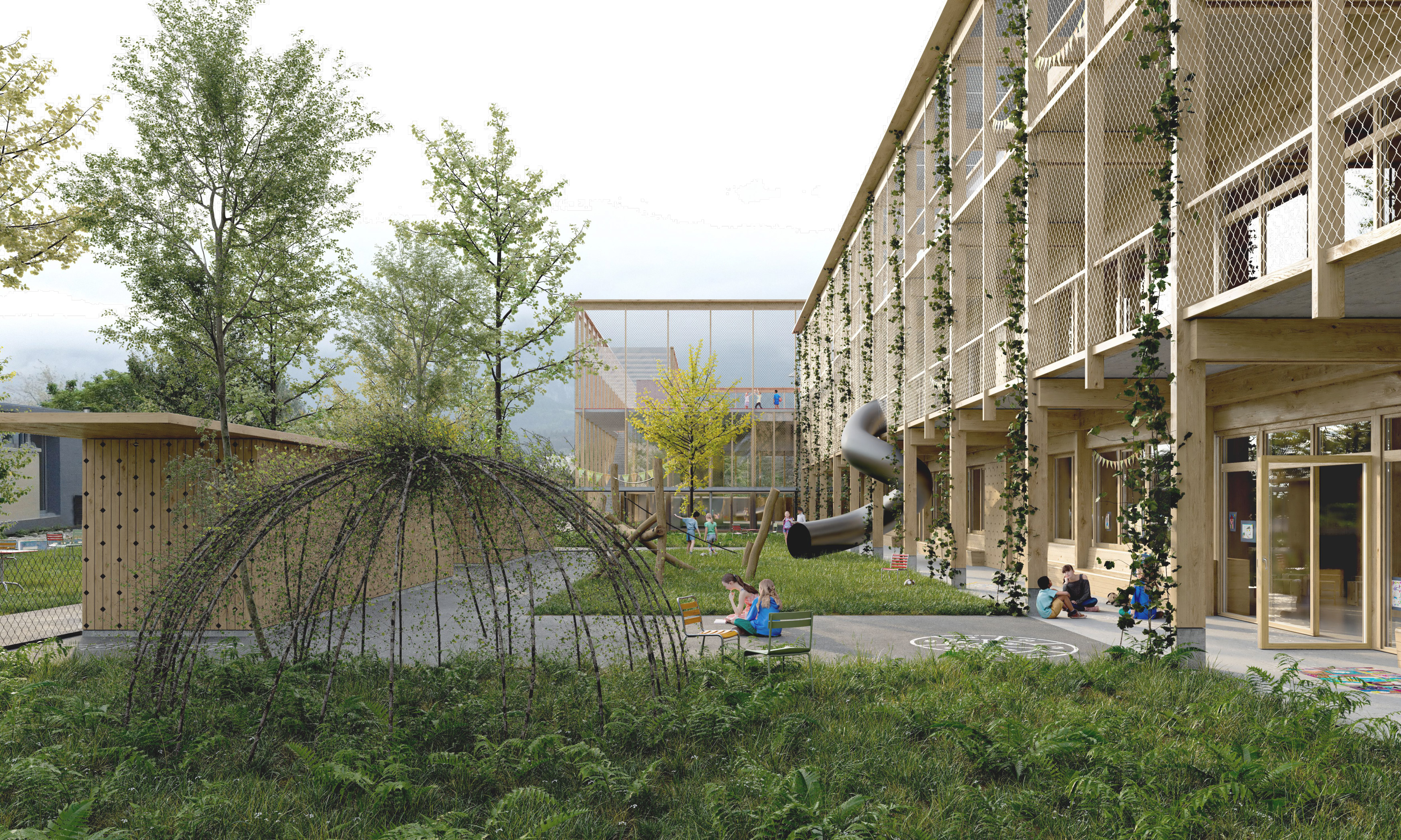 Innen- und Aussenräume sind geschickt verwoben. Es entsteht eine vielschichtige Freiraumlandschaft mit offenen und gedeckten Spielorten und Plätzen, Terrassen und Gärten auf verschiedenen Ebenen. Auch die Dächer können als Freiraum genutzt werden, eine Rutschbahn führt nach unten. In der Ecke Nordost zum Siegenthalergut hin ist der neue Ankunftsplatz mit Treppenaufgang vorgesehen – das öffentliche Gesicht der Schule. Im Erdgeschoss entsteht ein Mehrzweckraum, welcher der Bevölkerung offensteht, ebenso wie der neue Pausenhof und die weiteren Aussenräume. Lärmschutzwände können zum Malen und Bouldern genutzt werden.