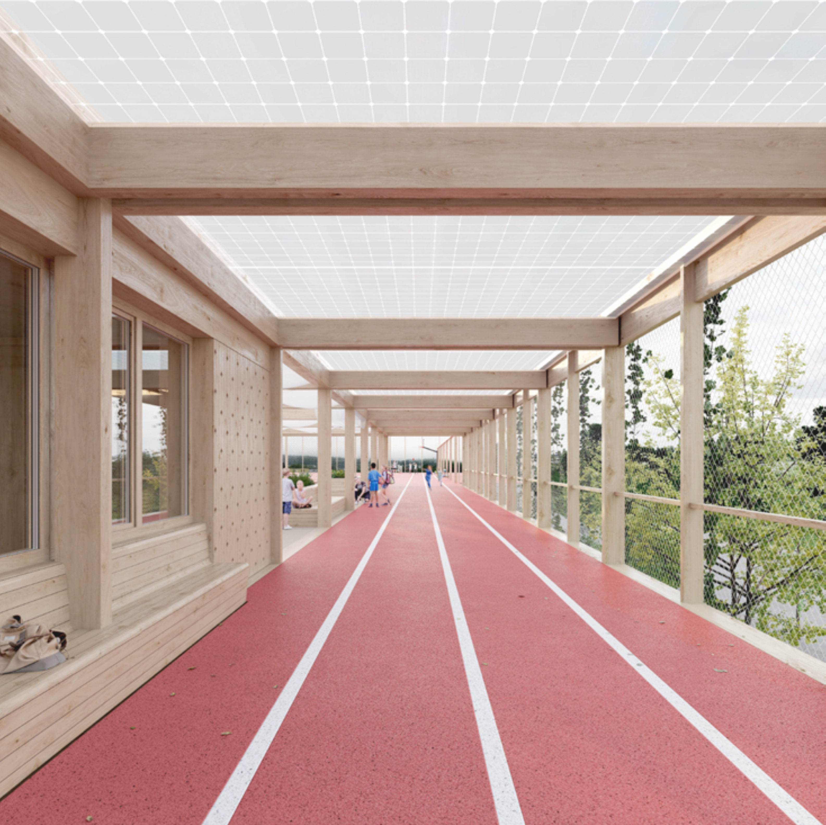 Das Projekt hält die höchsten energetischen und ökologischen Standards ein. Dank PV-Anlagen wird die Schule mit erneuerbarer Energie versorgt. Zudem ist ein hoher Grünanteil mit Förderung der Biodiversität vorgesehen. Auf versiegelte Flächen wird wo möglich verzichtet.